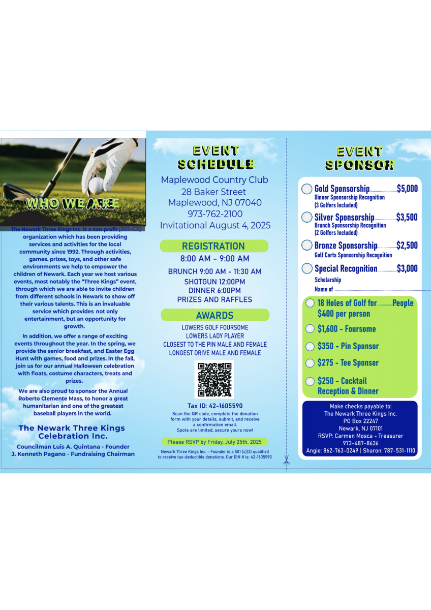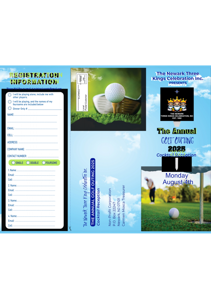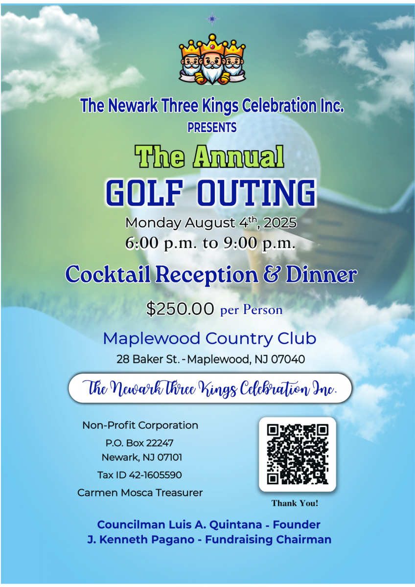 Join us this August for the Newark Three Kings Annual Golf Outing—an exciting day of sportsmanship, networking, and community spirit! Families, friends, and supporters are invited to tee off at Maplewood Country Club for a day filled with competition, camaraderie, and cause. Enjoy brunch from 9:00 AM to 11:30 AM, a 12:00 PM shotgun start, and cap off the evening with a 6:00 PM dinner, games, prizes, and raffles. Don't miss this unforgettable experience—reserve your spot today!